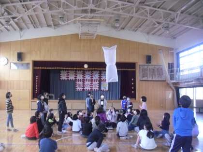 授業の様子(2月17日)その2 公開日 2021/02/17 更新日 2021/02/17 今日のできごと 4年生が、理科で学習した、空気の温まり方を発展させて、ビニール袋の下から、暖かな空気を送り込み、気球のようにして上に上っていく様子を観察しました。