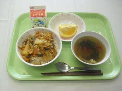 献立は、キムチ丼、牛乳、春雨スープ、くだもの(いよかん)でした。