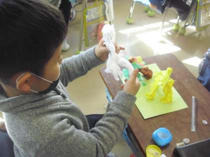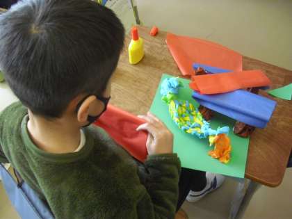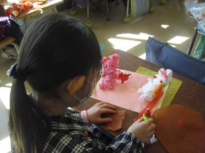 1年生が、図工の時間に、「くしゃくしゃしたら大変身」という題で、いろいろな色の薄紙をくしくしゃして、様々なものに変身させました。