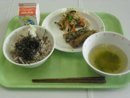 献立は、旭茶漬け、牛乳、ちくわの磯辺揚げ、カリカリ油揚げとお浸しで、6年生のリクエストメニューでした。