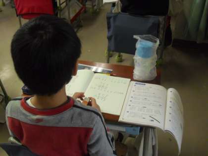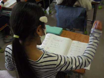 2年生が、算数の時間に、教科書の2年生のまとめの問題を解き、ノートに書きました。一人一人が、自力で解決して、問題を解くことを進めています。