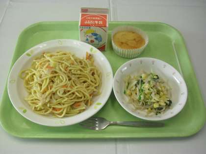 献立は、キャベツとツナのスパゲッティ、牛乳、青菜のサラダ、チーズケーキでした。