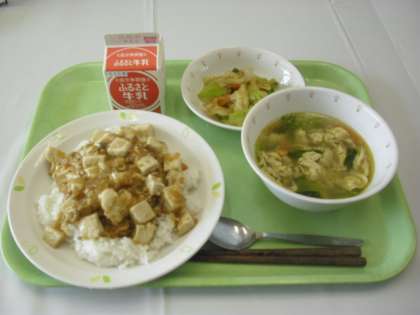 献立は、麻婆豆腐丼、牛乳、野菜の中華あえ、中華スープでした。