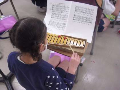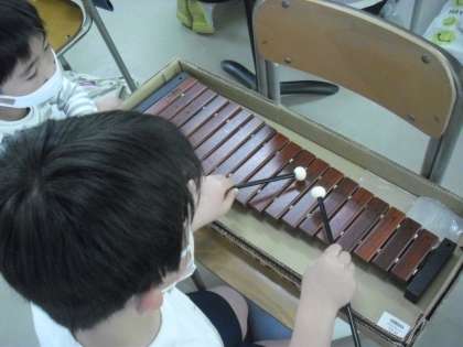3年生が、音楽の時間に、茶摘みのリズムうちをしてから、ミッキーマウスマーチの合奏をするために、木琴や鉄琴の練習をしました。