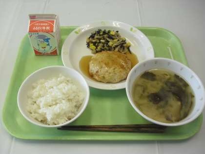 献立は、麦ごはん、牛乳、豆腐入りさくさくつくね、大根とひじきのサラダ、みそ汁です。