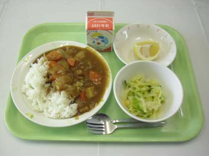 献立は、カレーライス、牛乳、グリーンサラダ、くだもの(はるか)でした。