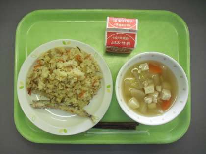 献立は、豚肉とごぼうのごはん、牛乳、ししゃものから揚げ、豆腐汁でした。