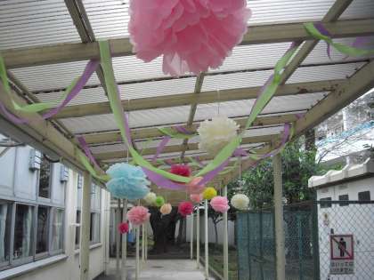 体育館への渡り廊下には、保護者の方が、お祝いの気持ちを込めて、飾り付けをしてくださいました。