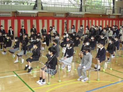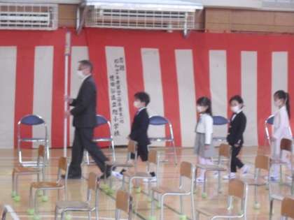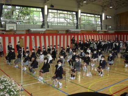 入学式の内容は、国歌斉唱(心の中で歌う)、校長式辞、担任等の紹介、お祝いの言葉、校歌斉唱(心の中で歌う)でした。