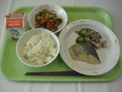 献立は、麦ごはん、牛乳、さわらの西京焼き、野菜のゆかりあえ、刻み昆布の五目煮でした。