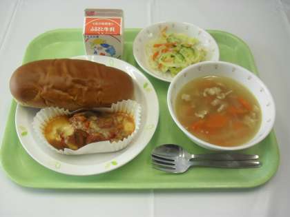 献立は、黒砂糖パン、牛乳、白身魚のピザ風、フレンチサラダ、白いんげんね田舎風スープでした。
