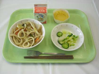 献立は、ちゃんこうどん、牛乳、野菜のひとしお、キャロットケーキでした。