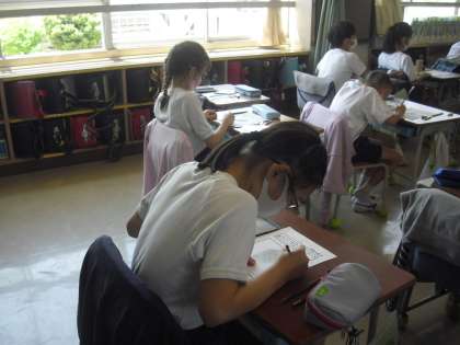 4年生が、理科の時間に、ヘチマの種の観察をして、観察カードに記録しました。