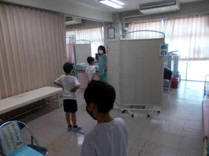 校医先生による内科健診の様子です。引き続きソーシャルディスタンスを保って実施しています。