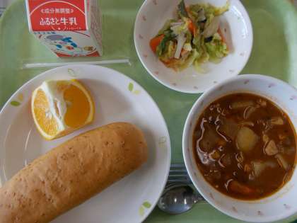 献立は、セサミパン、牛乳、ビーンズシチュー、野菜ソテー、甘夏みかんです。
