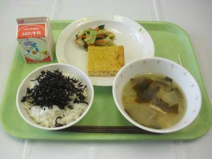 献立は、麦ごはん、牛乳、ひじきのふりかけ、卵焼き、野菜のおかかあえ、みそ汁でした。