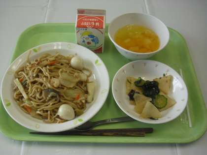 献立は、五目焼きそば、牛乳、大根の中華味、フルーツ白玉でした。