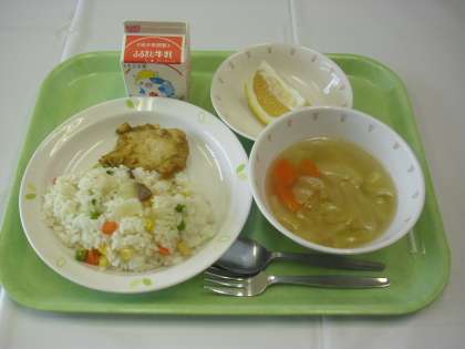 献立は、三色ピラフ、牛乳、鶏肉のカレー焼き、ベーコンと野菜のスープ、くだもの(美生みかん)でした。