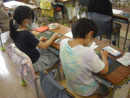 2年生が、図工の時間に、クレヨン(コンテ)を使って、いろいろな線を描いたり、たくさんぬったり、色のたし算をしたりして、表現方法を楽しみました。