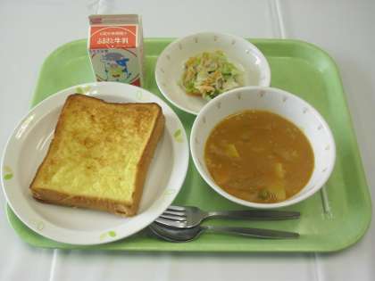 献立は、フレンチトースト、牛乳、ハンガリアンシチュー、ツナサラダでした。