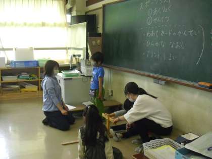 1年生が、教室でスポーツテスト(握力と前屈)を一人ずつしました。