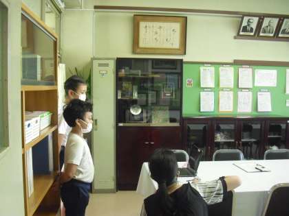 全校朝会のあいさつです。6年生の代表児童が、時候の話題やその時々に目標にするとよいことなどを話して、「朝のあいさつをしましょう」とかけ声をかけています。代表児童にとっては、緊張するひとときですが、話した後は、よい表情をしています。