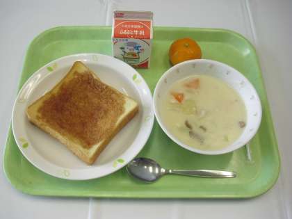 献立は、シナモントースト、牛乳、クリームシチュー、くだもの(冷凍みかん)でした。