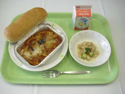 献立は、セサミパン、牛乳、なすのグラタン、ビーンズサラダでした。
