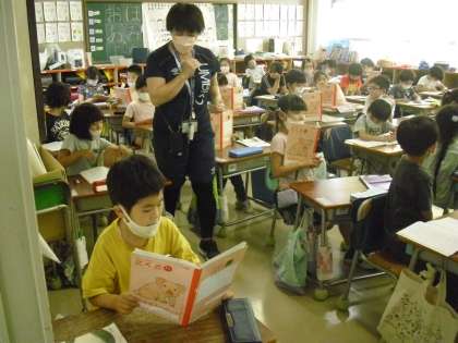 「年生が、国語の時間に、単元「わけをはなそう」で、自分の気持ちのわけを考えてノートに書き、伝える練習をして、2人組または3人組で、密にならないよう距離をとって、伝える活動をしました。
