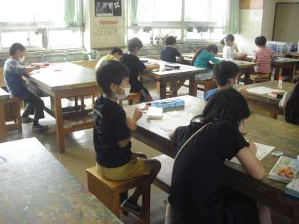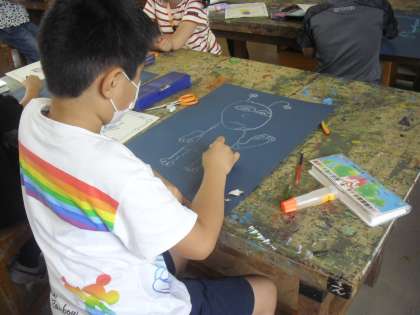 濃紺の画用紙にクレバスで描くという手法で、発色や混色、ぼかしなど、表現方法を確認してから、一人一人が表現しました。