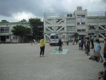 3年生が、世田谷警察の方に来ていただき、正しい自転車の乗り方を教わりました。そして、信号の渡り方、ジグザグの道、止まっている車の横を通り大通りに出る時などを、実際に自分の自転車に乗ってやってみました。