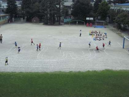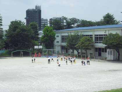 2年生が、体育の時間に、輪を使って基本の運動をしたり、走ったりしました。