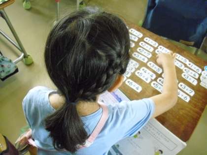 1年生が、算数の時間に、たし算カードを使って、並べ方のきまりを考えました。