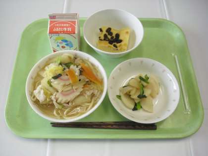 献立は、旭ラーメン、牛乳、かぶのレモンじょうゆ和え、レーズンケーキです。