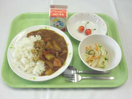 献立は、カレーライス、牛乳、フレンチサラダ、さくらんぼでした。