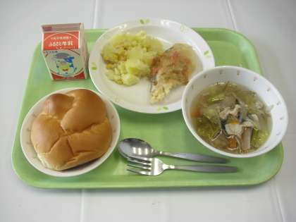 献立は、ミルクパン、牛乳、白身魚のエスカベージュ、コーンポテト、ベーコンと白菜のスープです。