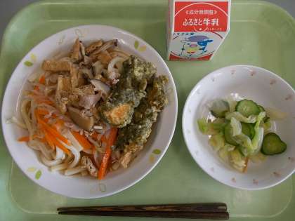 献立は、五目冷やしうどん、牛乳、いかの磯辺揚げ、ひとしお野菜でした。