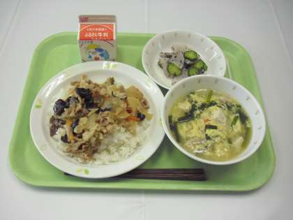 献立は、スタミナ丼、牛乳、にらたまスープ、大根のゆかり和えでした。