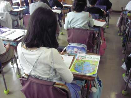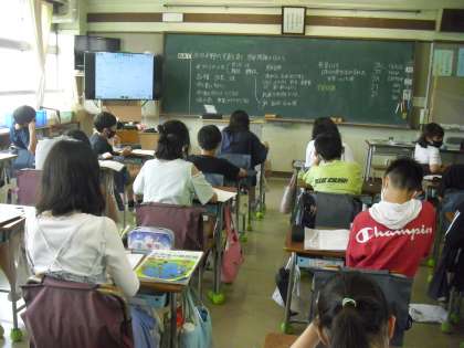 5年生が、社会科の時間に、米作りのさかんな地域を学習するために、庄内平野の米作りについて調べて、「農家の人は米作りをざのように進めているのか」という学習問題を作りました。