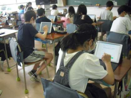 授業の様子(7月14日)その2 公開日 2021/07/14 更新日 2021/07/14 今日のできごと 6年生が、理科の時間に、1学期学んだことを復習しました。タブレットのキュビナを使って、問題を解きながら、学習内容を確認しました。