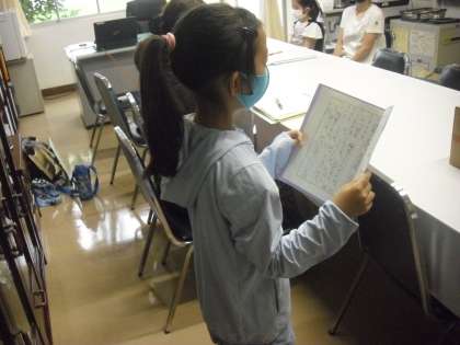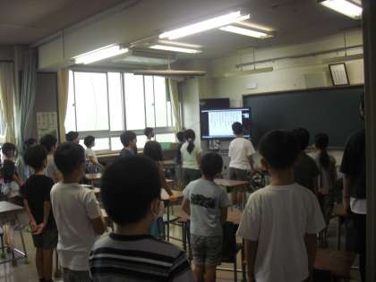 初めに、校長が2学期は、「自分の考えをもつ」ことを頑張ってほしいことを話しました。次に、2年生の代表児童が、「跳び箱をがんばったり、手をあげて発言することがんばったりしたい」と2学期の抱負を話しました。最後に、校歌を心の中で歌いました。