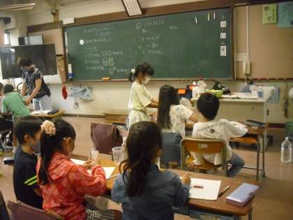 2年生が、算数の時間に、「水のかさくらべをしよう」という目標で、実際に水を入れて比べました。