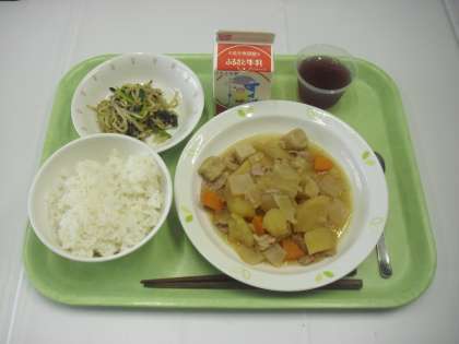 給食(9月9日) 公開日 2021/09/09 更新日 2021/09/09 今日のできごと 献立は、麦ごはん、牛乳、肉じゃがうま煮、小松菜の乾物あえ、ぶどうゼリーでした。 ゼリーを作る時に使うゼラチンは、牛や豚のたんぱく質からつくります。ゼラチンを最初につくった国は、エジプトだそうです。