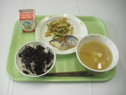 献立は、麦ごはん、牛乳、ひじきのふりかけ、魚の七味焼き、カリカリ油揚げと野菜のおひたしでした。