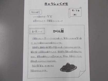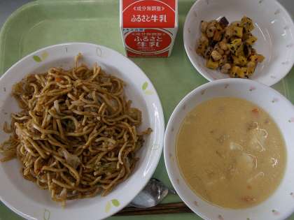 献立は、ソース焼きそば、牛乳、お豆かりんとう、中華風コーンスープです。
