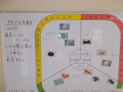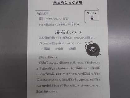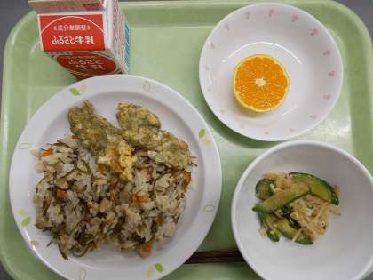 献立は、鶏肉とごぼうのごはん、牛乳、いかの磯辺揚げ、ごま酢あえ、菊花みかんです。