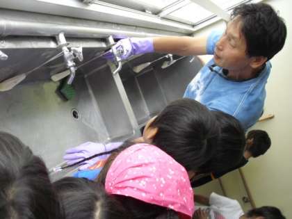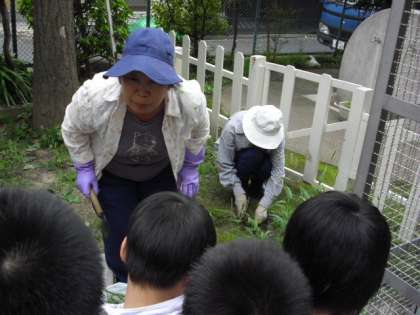 1年生が、「学校の用務主事さん」という勉強をしています。用務主事さんから話を聞いたり、仕事ぶりを見学したりしました。用務主事さん達は、登下校の安全指導・学校施設の清掃や補修・校外学習の付き添いなど、子ども達が安全に気持ちよく生活できるように、いろいろな仕事をしています。何よりうれしいことは、子ども達の元気な笑顔とあいさつだそうです。用務主事の皆さん、いつも、ありがとうございます。