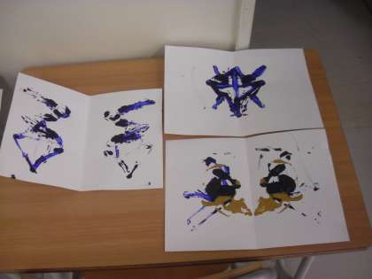 授業の様子(9月27日)その2 公開日 2021/09/27 更新日 2021/09/27 今日のできごと ひまらや学級の児童が、図工の時間に、合わせ絵(デカレコマニー)をして、想像をふくらませました。