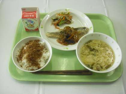 献立は、麦ごはん、牛乳、かつおでんぶ、ほっけの甘酢あんかけ、青菜のおひたし、にらたま汁でした。