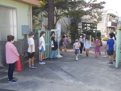 代表委員の児童が率先して礼儀正しく挨拶をしています。